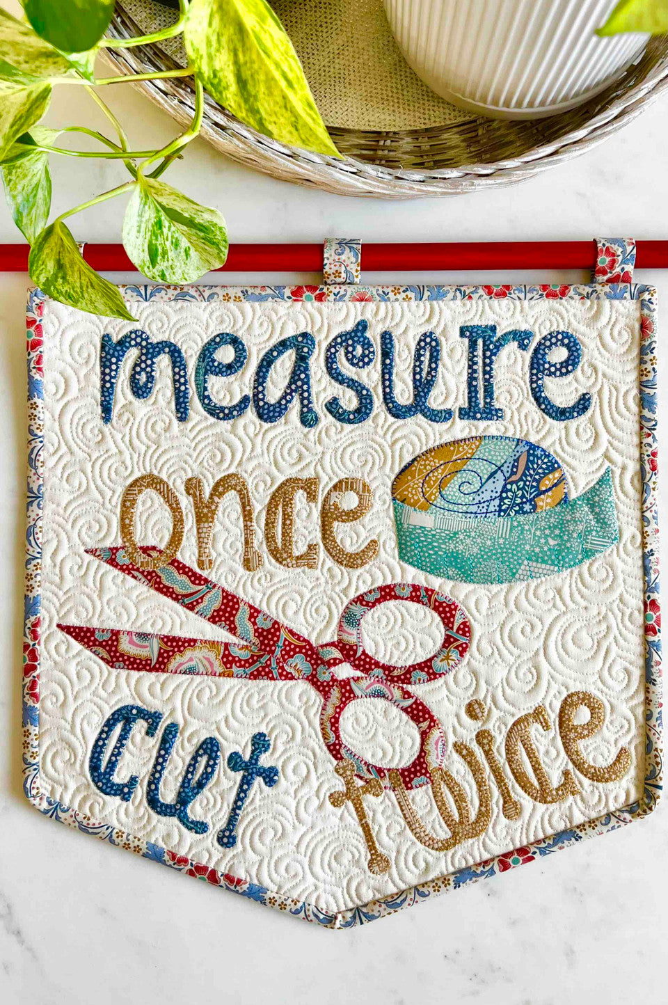 "Measure Once, Cuss Twice" is a play on words fun Mini Quilt. Featuring your favourite sewing notions this Mini Quilt will be perfect for your sewing space or great for when you need a Quilt Swap project.