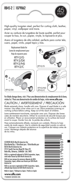 For Original 45mm Rotary Cutter (RTY2), Deluxe 45mm Rotary Cutter (RTY2DX) and Quick-Change Rotary Cutter (RTY2NS). 2 blades per pack.