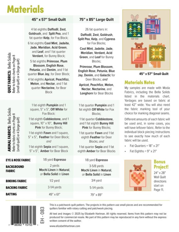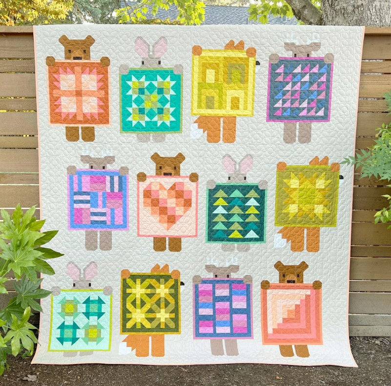 These forest friends are excited to show off their latest finishes at tonight's guild meeting! The fat quarter-friendly pattern includes instructions for making three quilt sizes including 4 different animals (foxes, bunnies, deer, and bears) and their 12 different patchwork quilts.